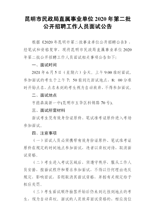 2020年昆明市民政局直屬事業(yè)單位第二批招聘面試公告