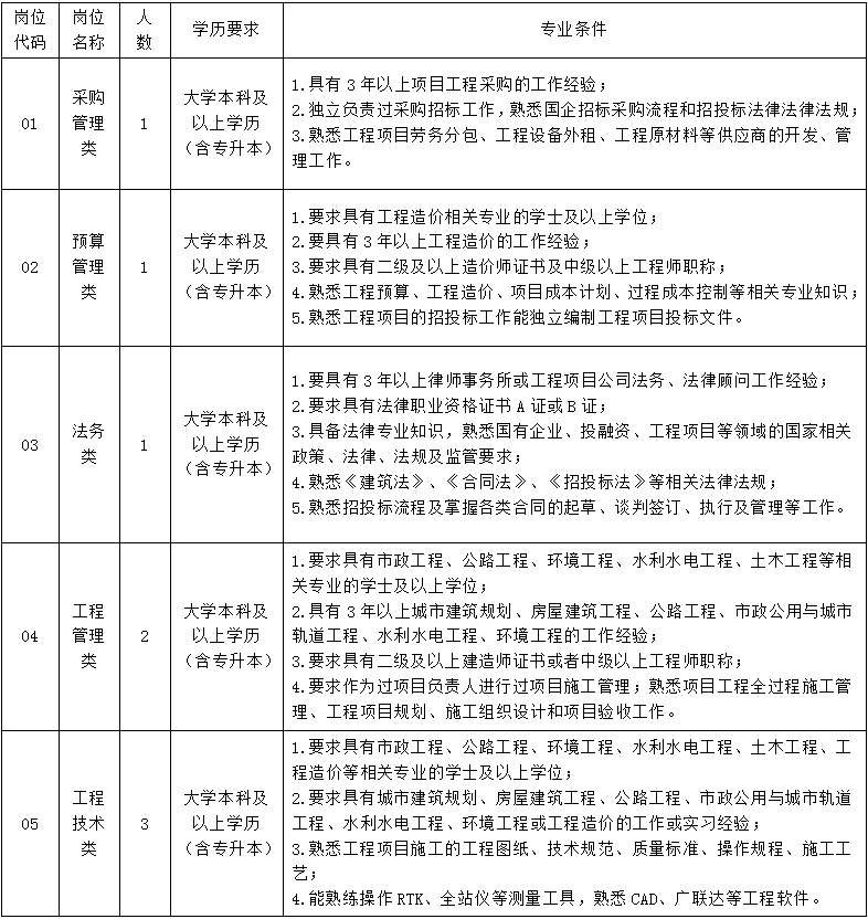 本次招聘面向社會公開招聘,招聘人數(shù)預計10人:采購管理類1人,預算管理類1人,法務類1人,工程管理類2人、工程技術(shù)類3人、財務類2人。