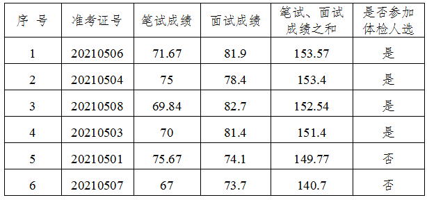 根據(jù)筆試、面試成績(jī)之和從高到低的順序,按1:2的比例確定參加體檢人選。筆試面試成績(jī)及參加體檢人選名單如下: