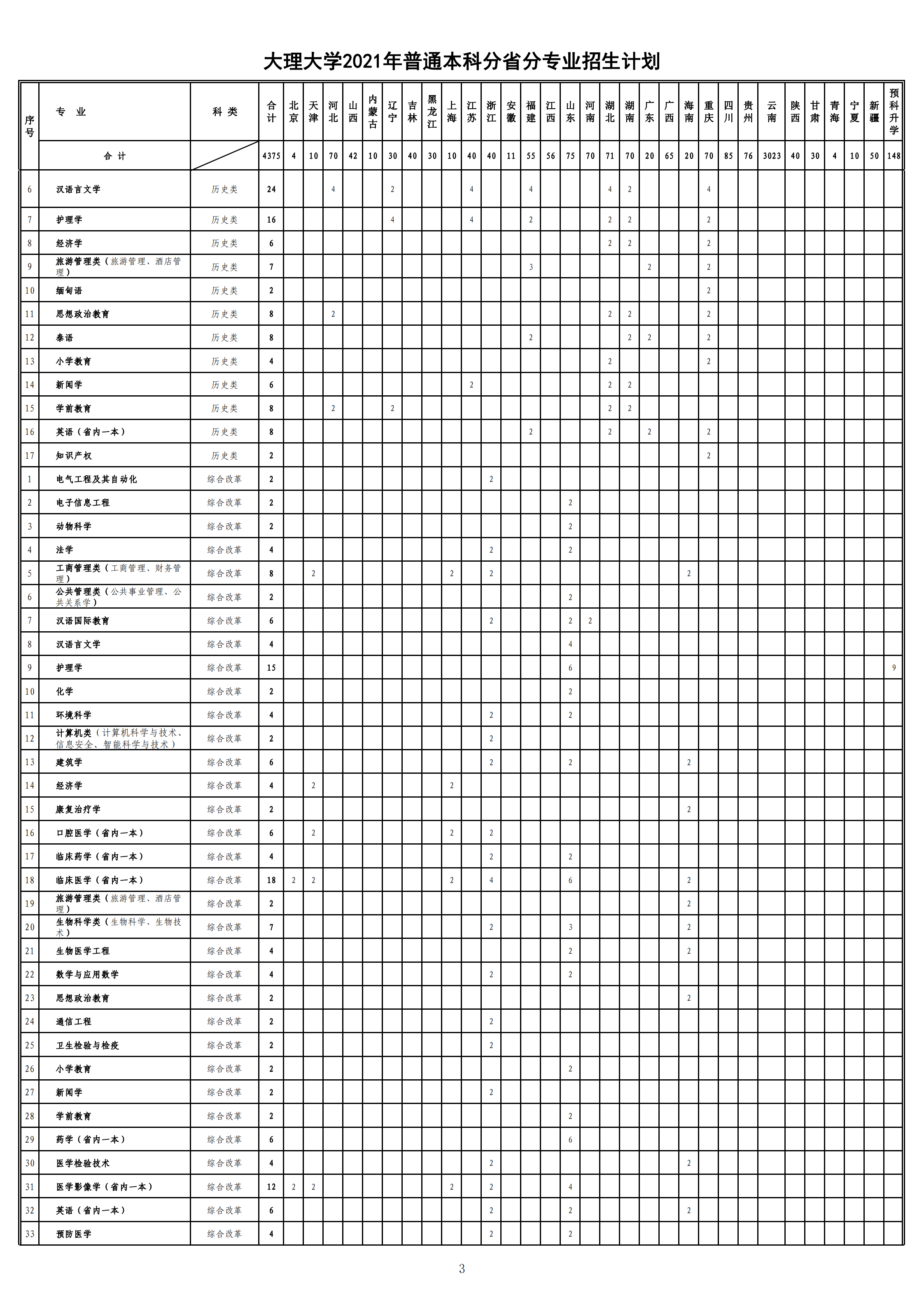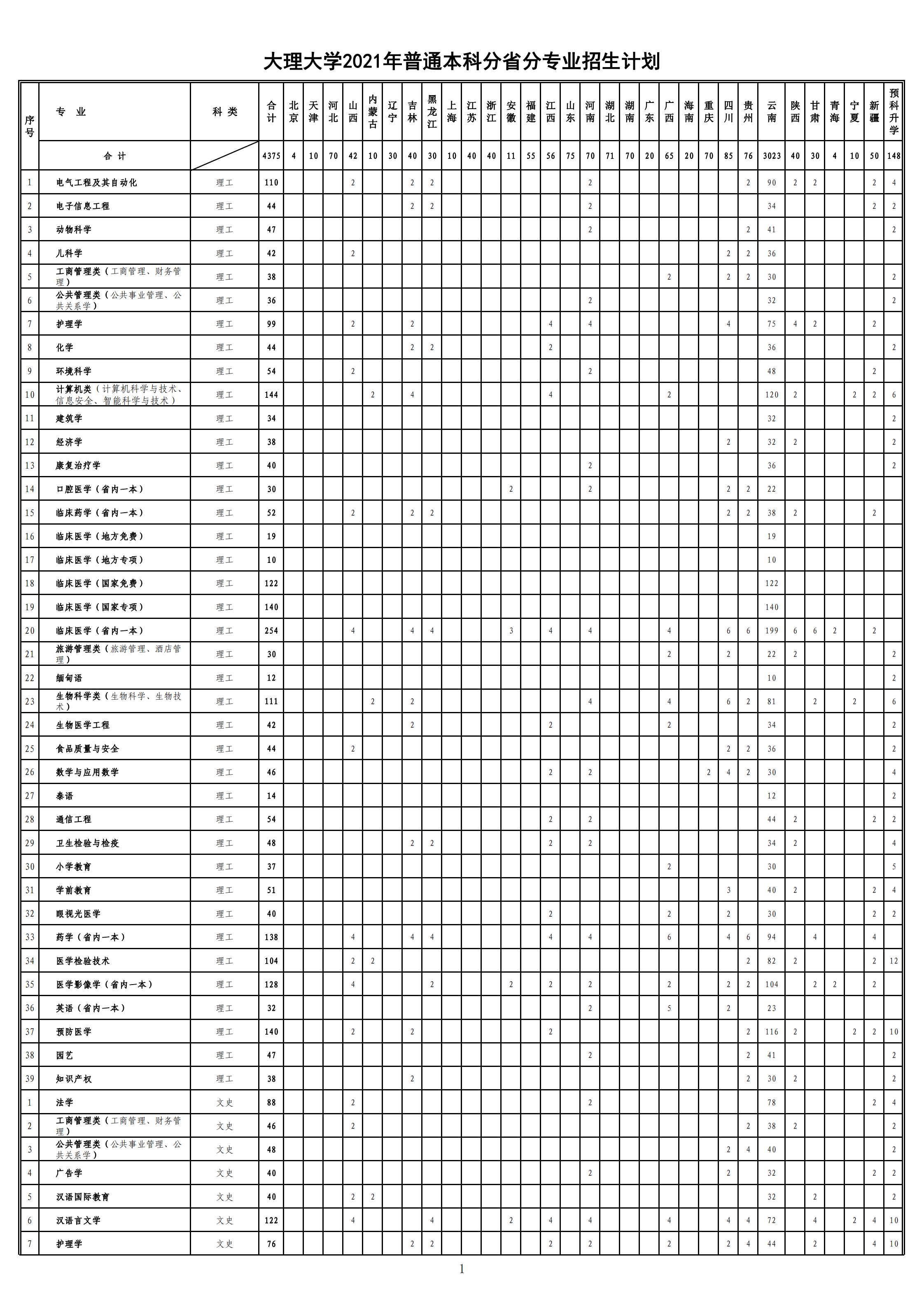 大理大學2021年普通本科分省分專業(yè)招生計劃