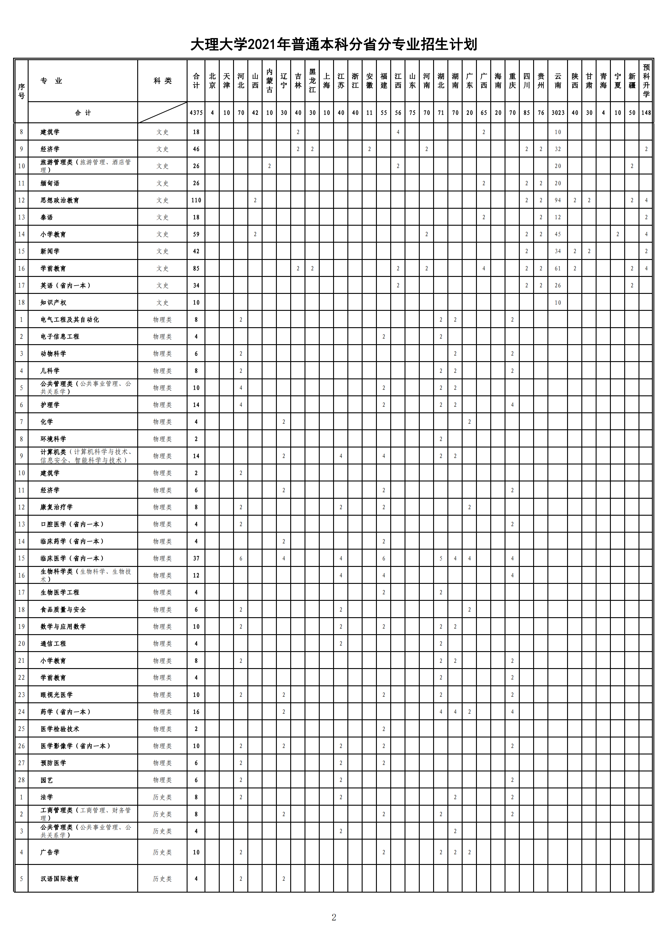 2021年大理大學普通本科分省分專業(yè)招生計劃