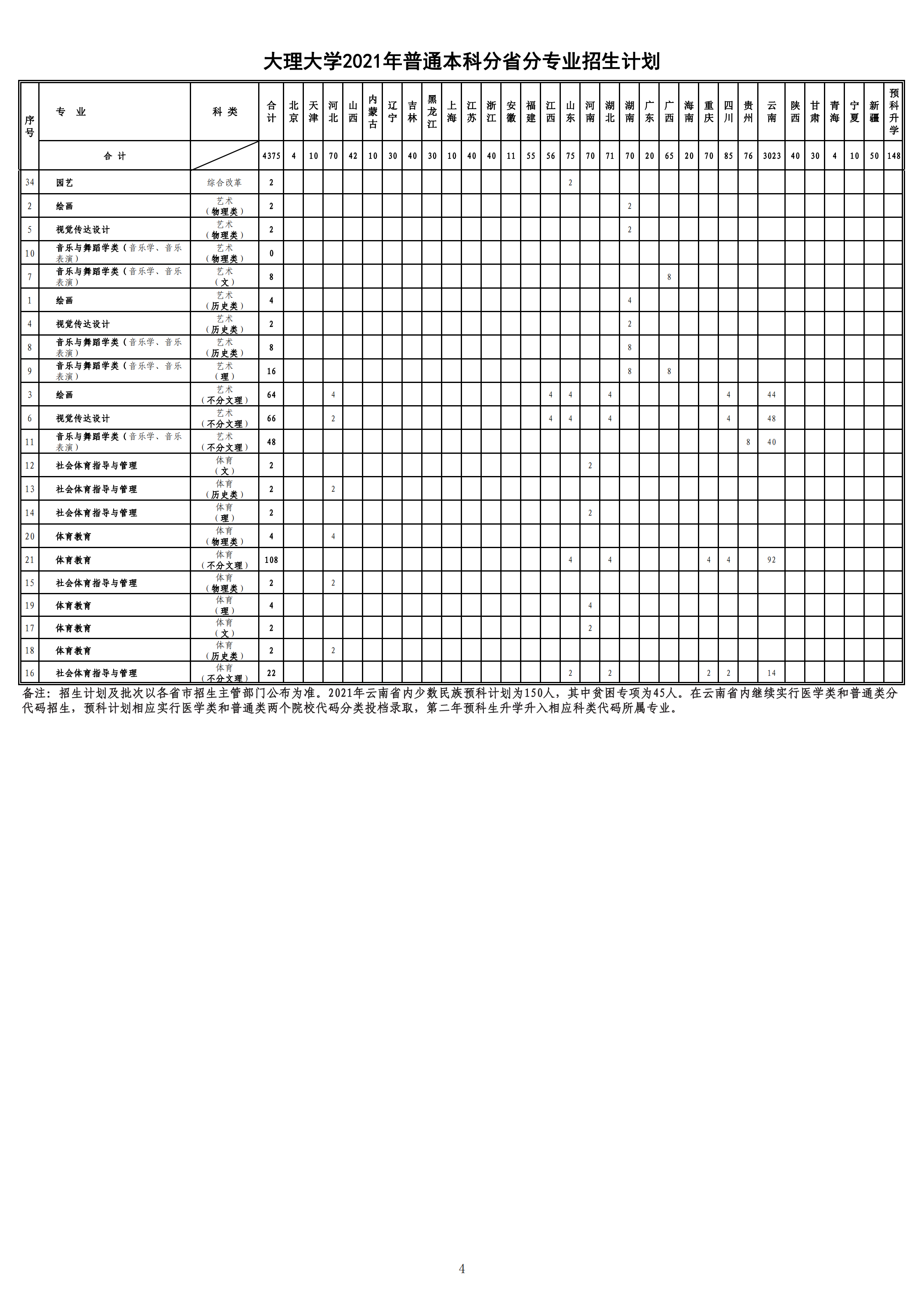 大理大學2021年普通本科分省分專業(yè)招生計劃 來源:http://zs.dali.edu.cn/?p=14&a=view&r=367