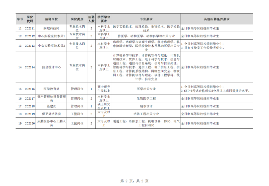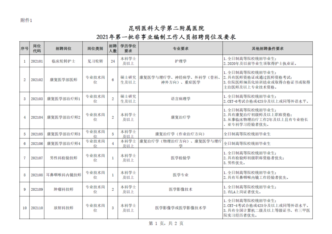 詳見附件1:《昆明醫(yī)科大學(xué)第二附屬醫(yī)院2021年度第一批非事業(yè)編制工作人員招聘崗位及要求》。