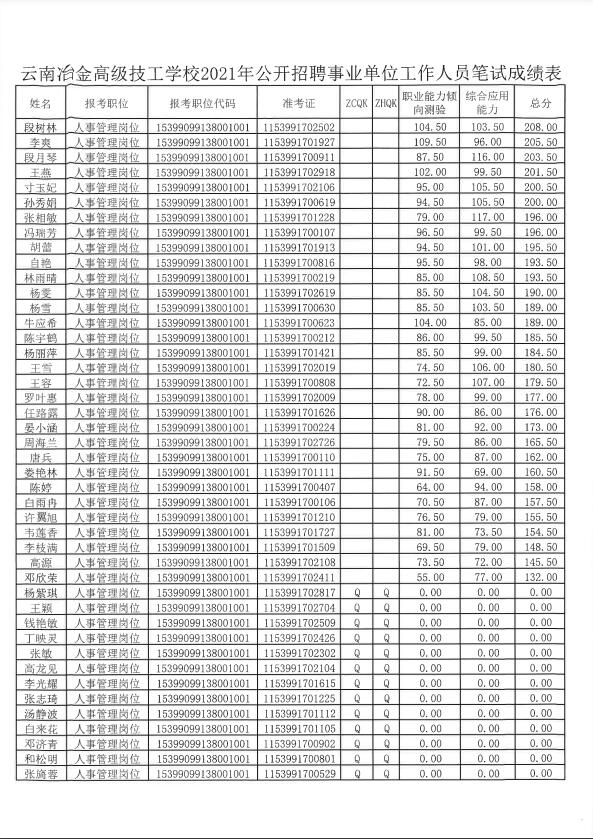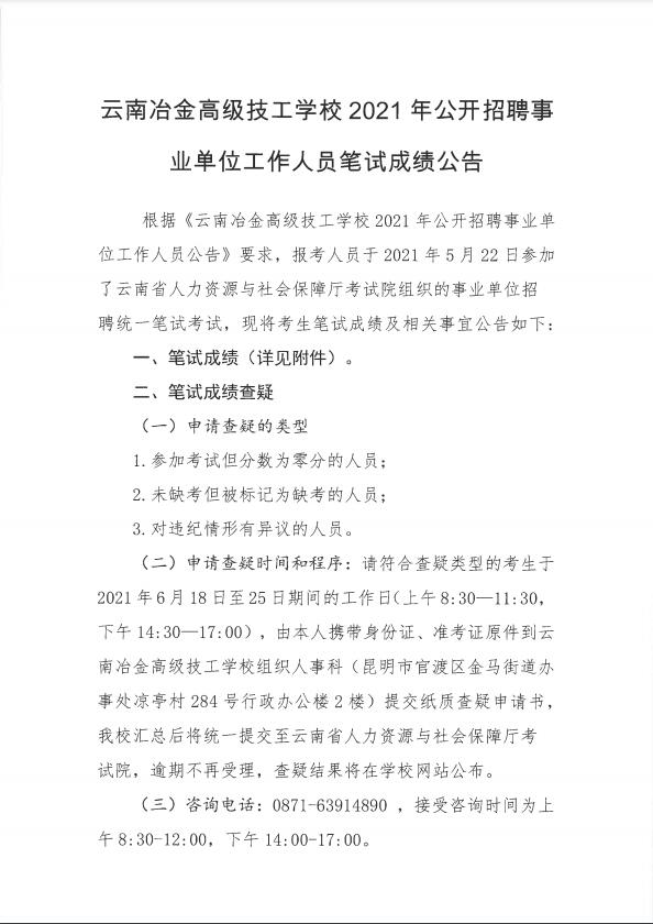 云南冶金高級(jí)技工學(xué)校2021年公開招聘事業(yè)單位工作人員筆試成績(jī)公告