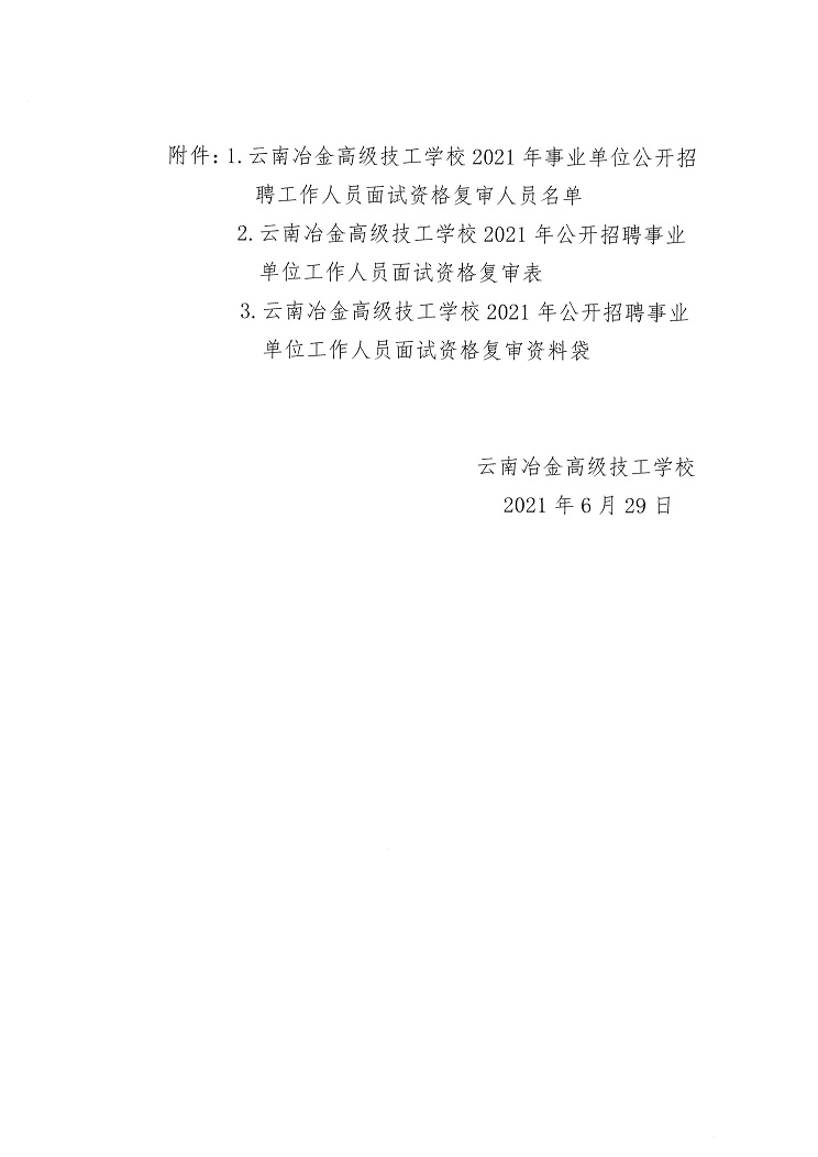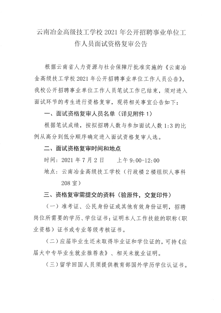 關(guān)于參加云南冶金高級技工學(xué)校2021年公開招聘事業(yè)單位工作人員面試資格復(fù)審公告