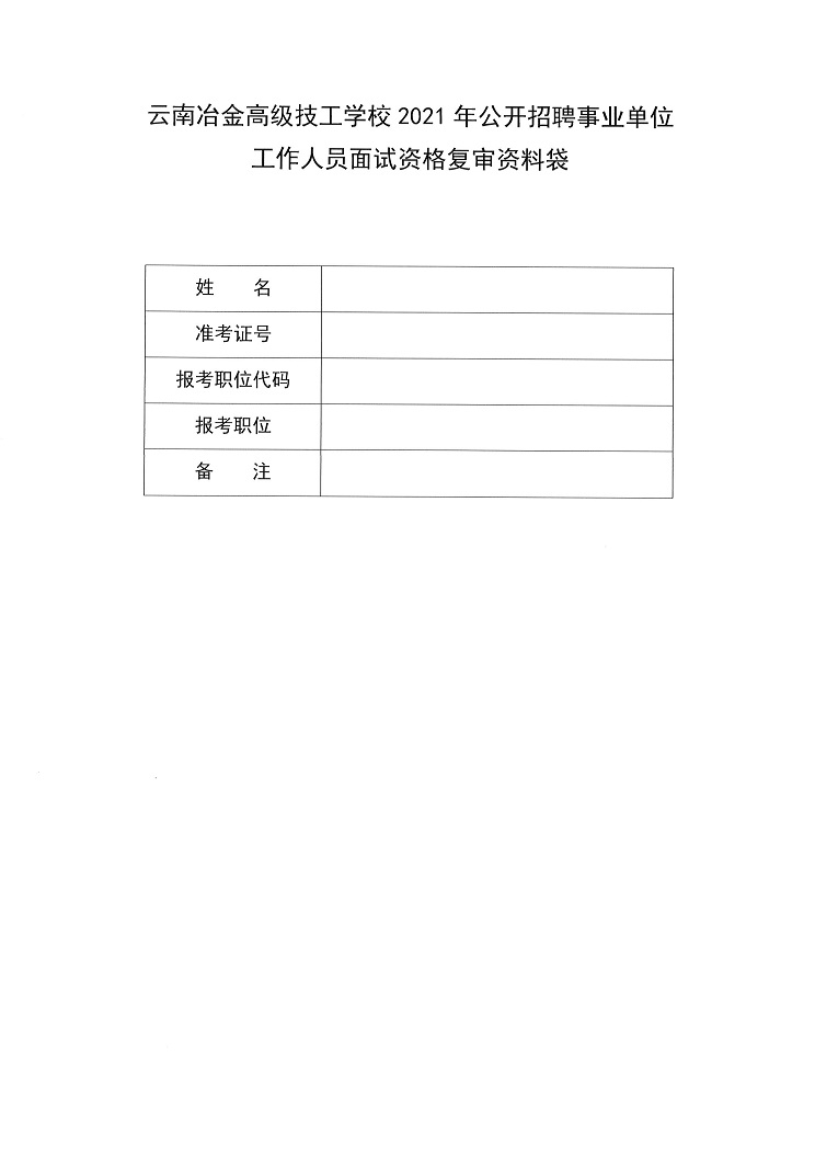 關(guān)于參加云南冶金高級技工學(xué)校2021年公開招聘事業(yè)單位工作人員面試資格復(fù)審資料袋