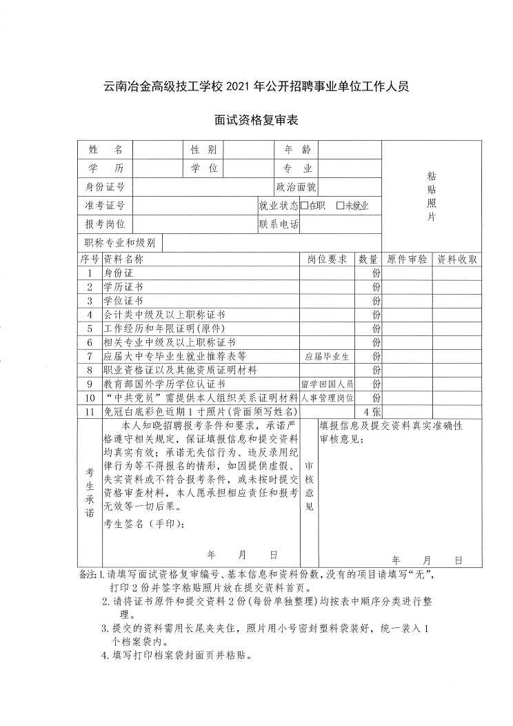 關(guān)于參加云南冶金高級技工學(xué)校2021年公開招聘事業(yè)單位工作人員面試資格復(fù)審表