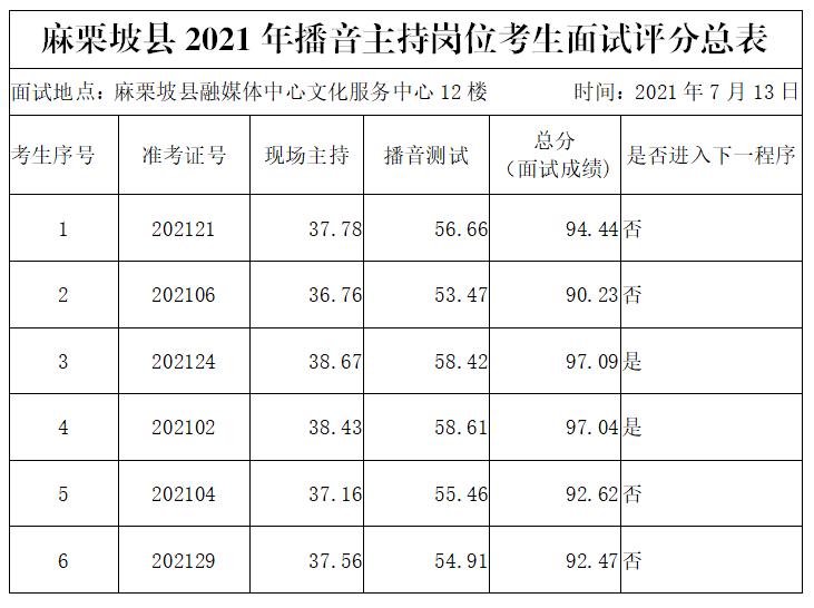 根據(jù)《2021年文山州事業(yè)單位公開招聘工作人員通告》和《麻栗坡縣2021年事業(yè)單位公開招聘工作人員面試有關(guān)事項的通告》要求,麻栗坡縣融媒體中心播音主持(崗位代碼15326241101)公開招聘工作人員已完成面試工作,現(xiàn)將考生綜合成績公告如下: