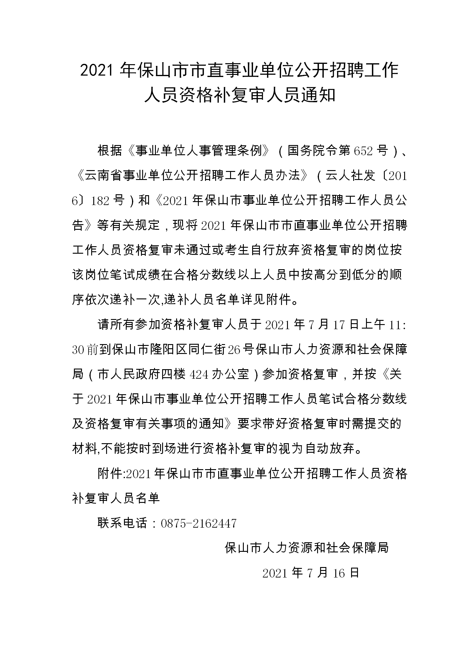 2021年保山市市直事業(yè)單位公開招聘工作人員資格補復(fù)審人員通知