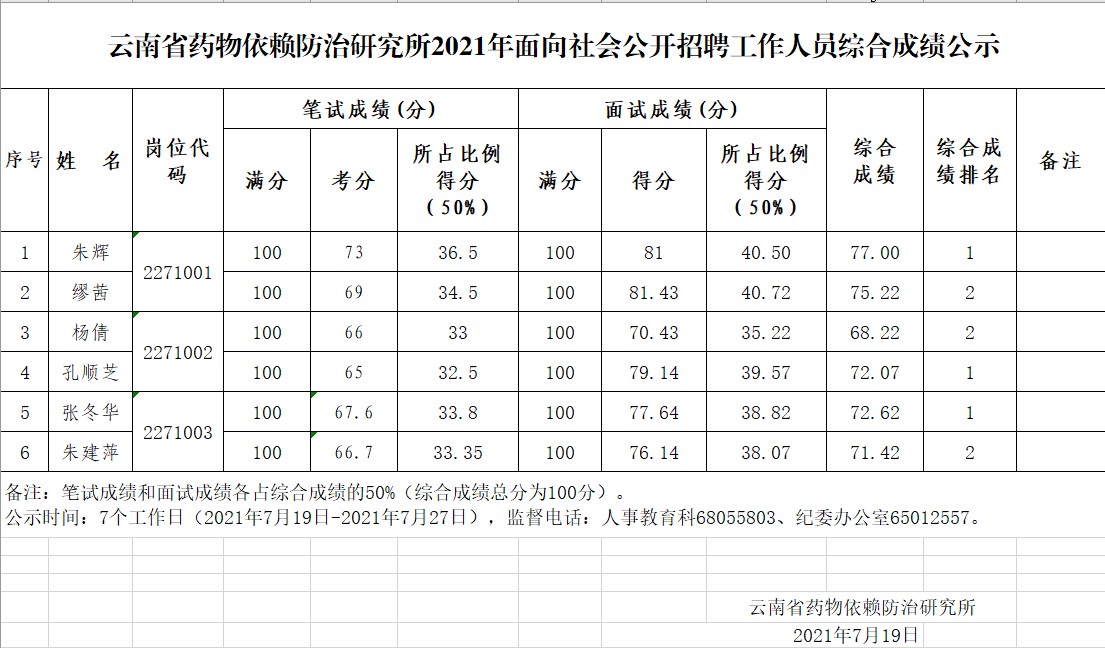 云南省藥物依賴防治研究所2021年面向社會(huì)公開招聘工作人員綜合成績(jī)公示