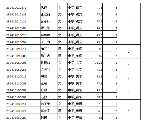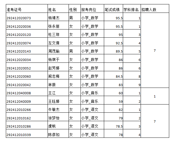 面試人員分崗位學(xué)科,按筆試成績(jī)從高到低,按不低于1:1.2的比例(進(jìn)一法)確定,若最后一名筆試成績(jī)出現(xiàn)并列,并列人員一并進(jìn)入面試。本次招聘進(jìn)入面試32人,名單如下: