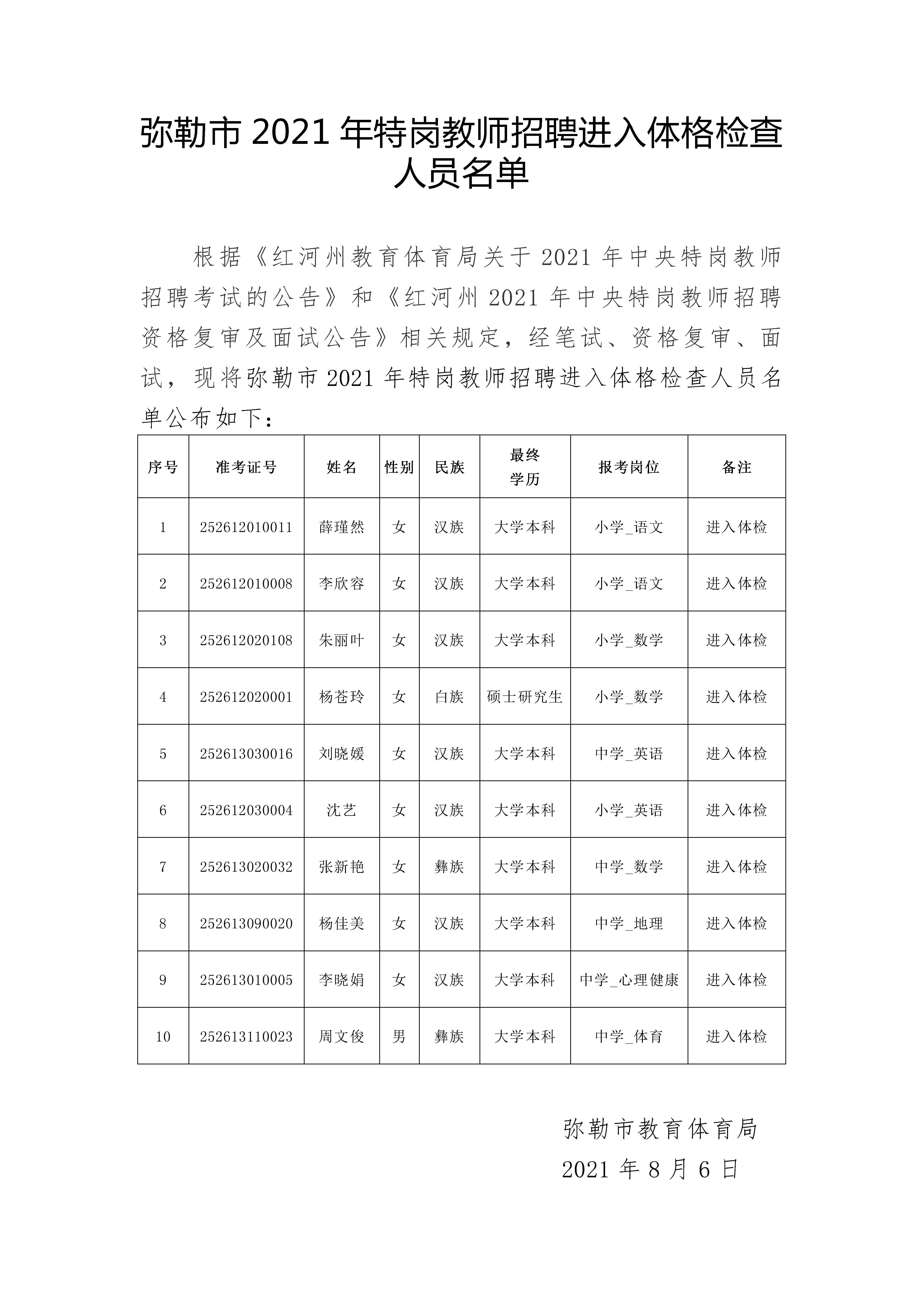彌勒市2021年特崗教師招聘進入體格檢查人員名單