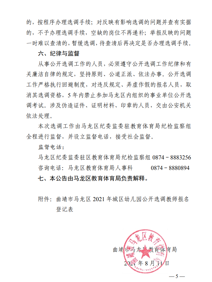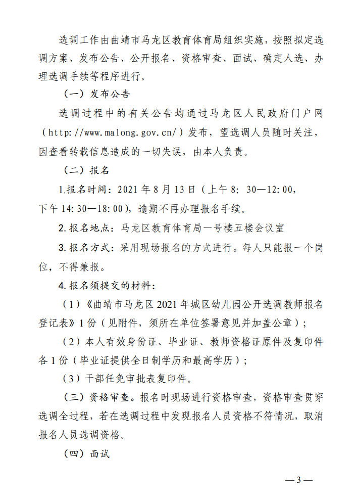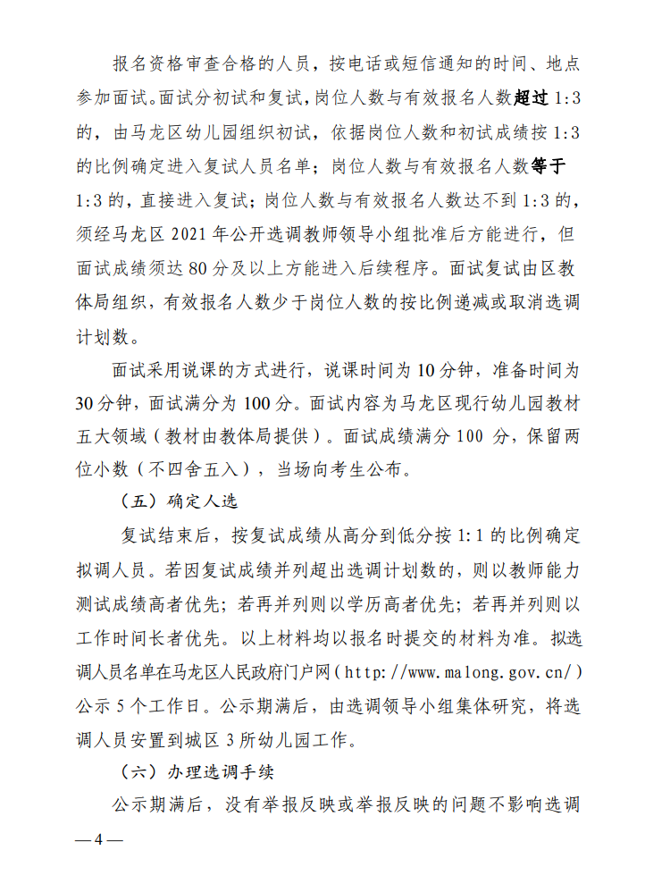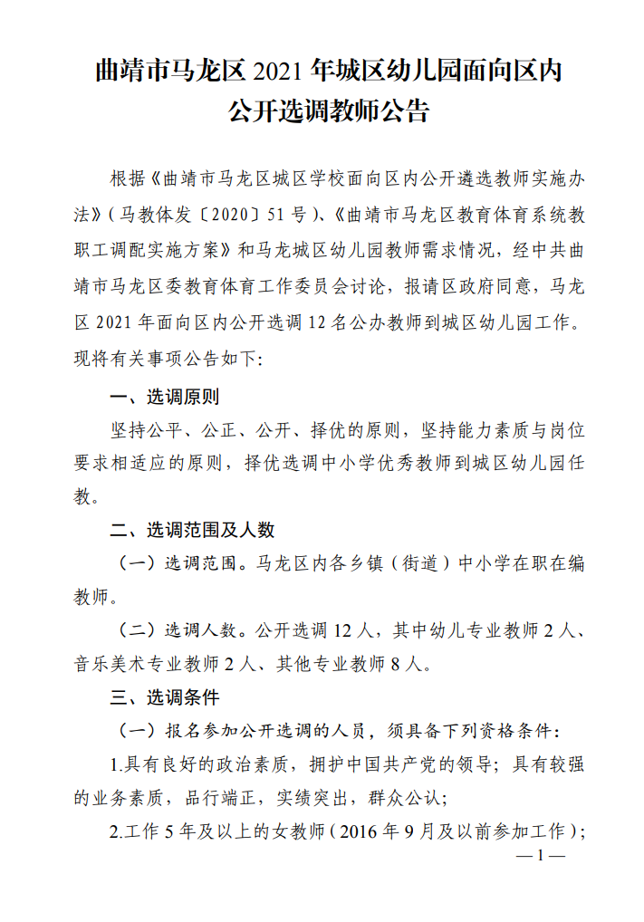 曲靖市馬龍區(qū)2021年城區(qū)幼兒園面向區(qū)內(nèi)公開(kāi)選調(diào)教師公告