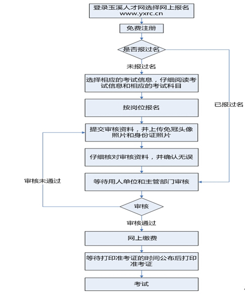 網(wǎng)絡(luò)報名的大致流程為:登錄玉溪人才網(wǎng)→網(wǎng)上報名入口→注冊→查看招聘崗位→按崗位報名并填寫報名資料→等待審核→審核通過→網(wǎng)上交費(注意查看交費狀態(tài),確認交費成功)→打印筆試準(zhǔn)考證(打印時間在筆試公告內(nèi)另行通知)→參加筆試。