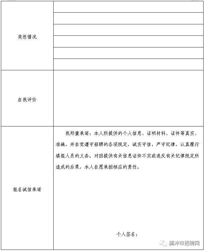 3.報(bào)名地點(diǎn):騰沖市人力資源和社會(huì)保障局人力資源市場(chǎng)辦公室(騰沖市騰越街道山源社區(qū)文筆小區(qū)272號(hào)四樓)。