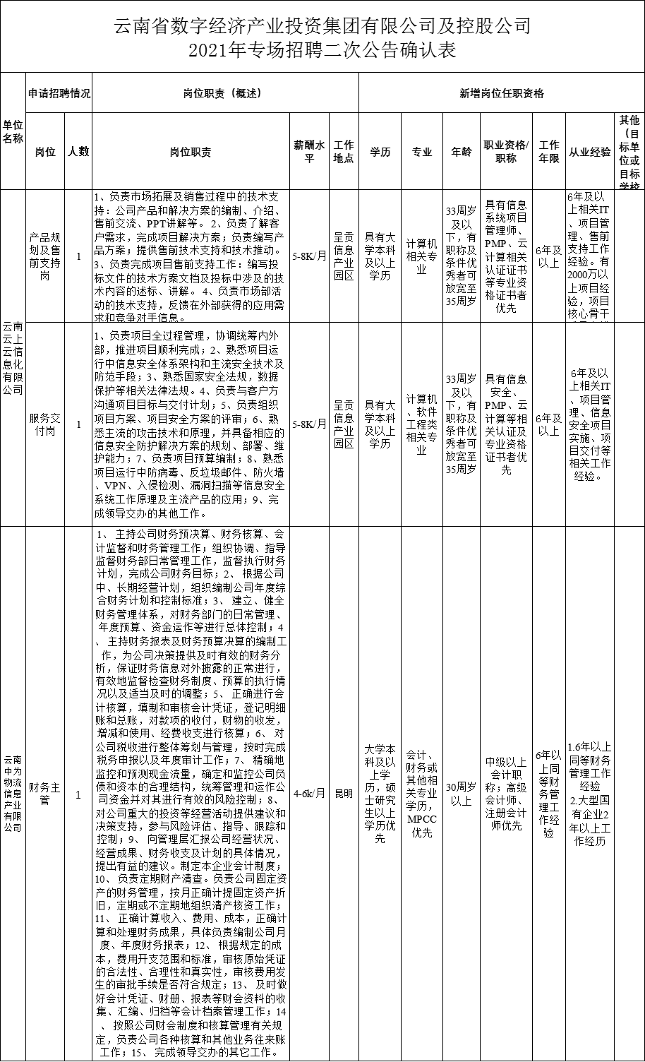 附件: 附件1:云南省數(shù)字經(jīng)濟(jì)產(chǎn)業(yè)投資集團(tuán)有限公司及控股公司2021年專場(chǎng)招聘崗位需求表(二次公告表)