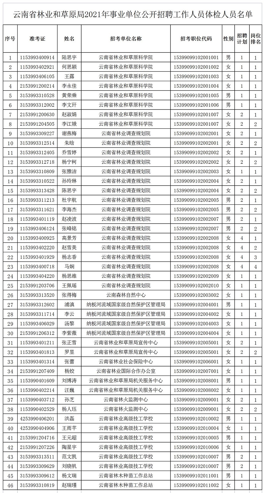 附件:云南省林業(yè)和草原局2021年事業(yè)單位公開(kāi)招聘工作人員進(jìn)入體檢人員名單