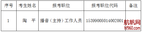 寧洱縣融媒體中心2021年特殊招聘播音(主持)工作人員招聘工作,經(jīng)發(fā)布公告、報名、資格復(fù)審、面試、考察、體檢程序,確定陶平為擬聘用人員?,F(xiàn)公示如下,公示時間從2021年9月6日起至9月14日止(共7個工作日),若信息有誤或?qū)M聘用人員有異議的,請與中共寧洱縣委組織部干部監(jiān)督科聯(lián)系。