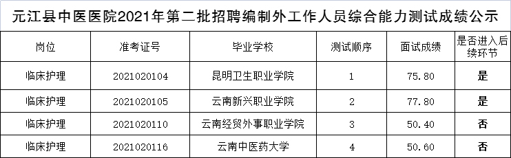 元江縣中醫(yī)醫(yī)院2021年第二批 招聘編制外工作人員綜合能力測試成績公示 來源:http://www.ynyxyjzyy.com/yuanjiang/xwzx/tzgg/399.html