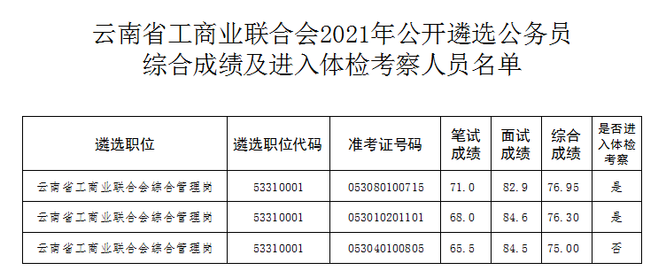 云南省工商業(yè)聯(lián)合會(huì)2021年公開遴選公務(wù)員綜合成績(jī)及進(jìn)入體檢考察人員名單公告