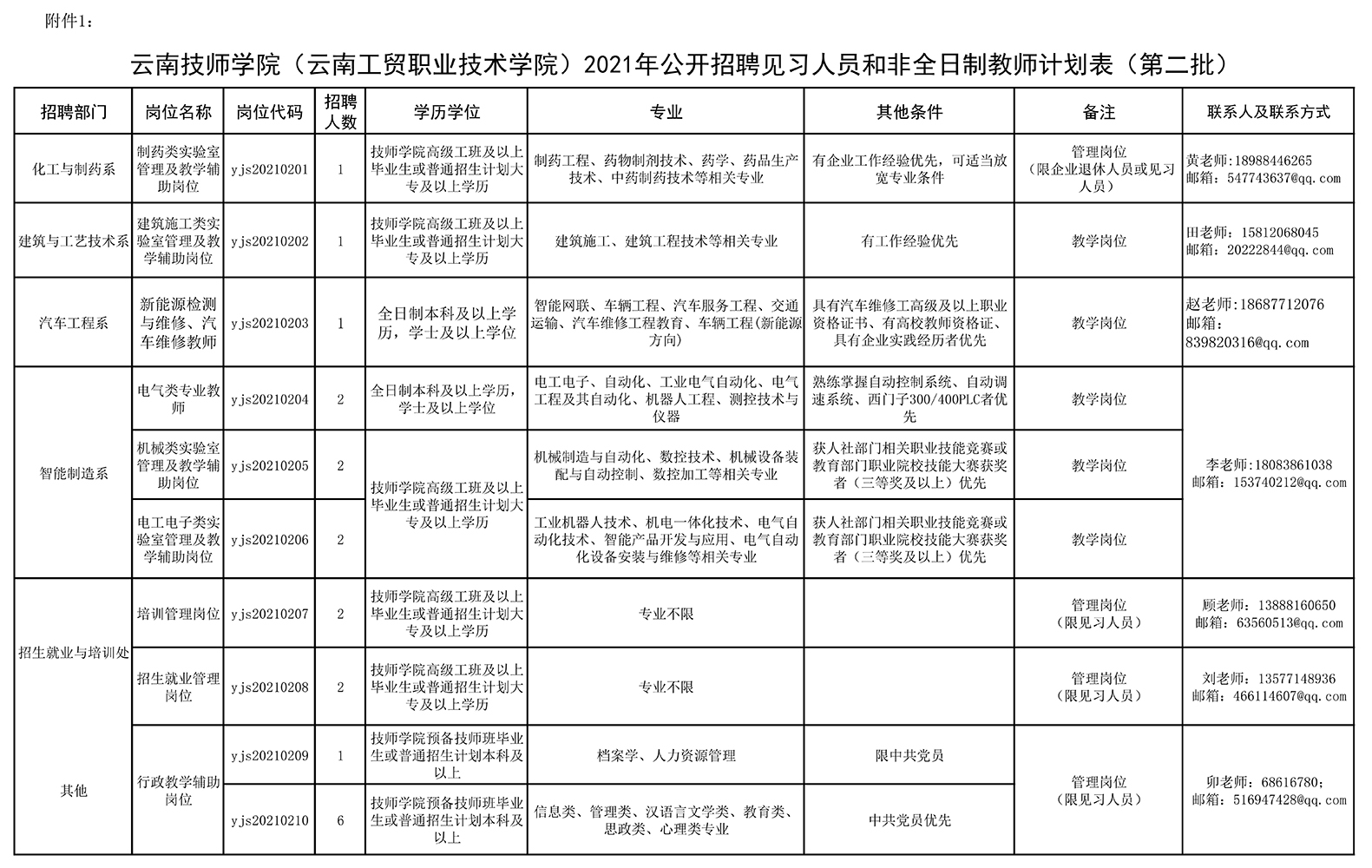 附件:1.云南技師學院(云南工貿(mào)職業(yè)技術(shù)學院)2021年公開招聘編制外見習人員和非全日制教師計劃表(第二批)