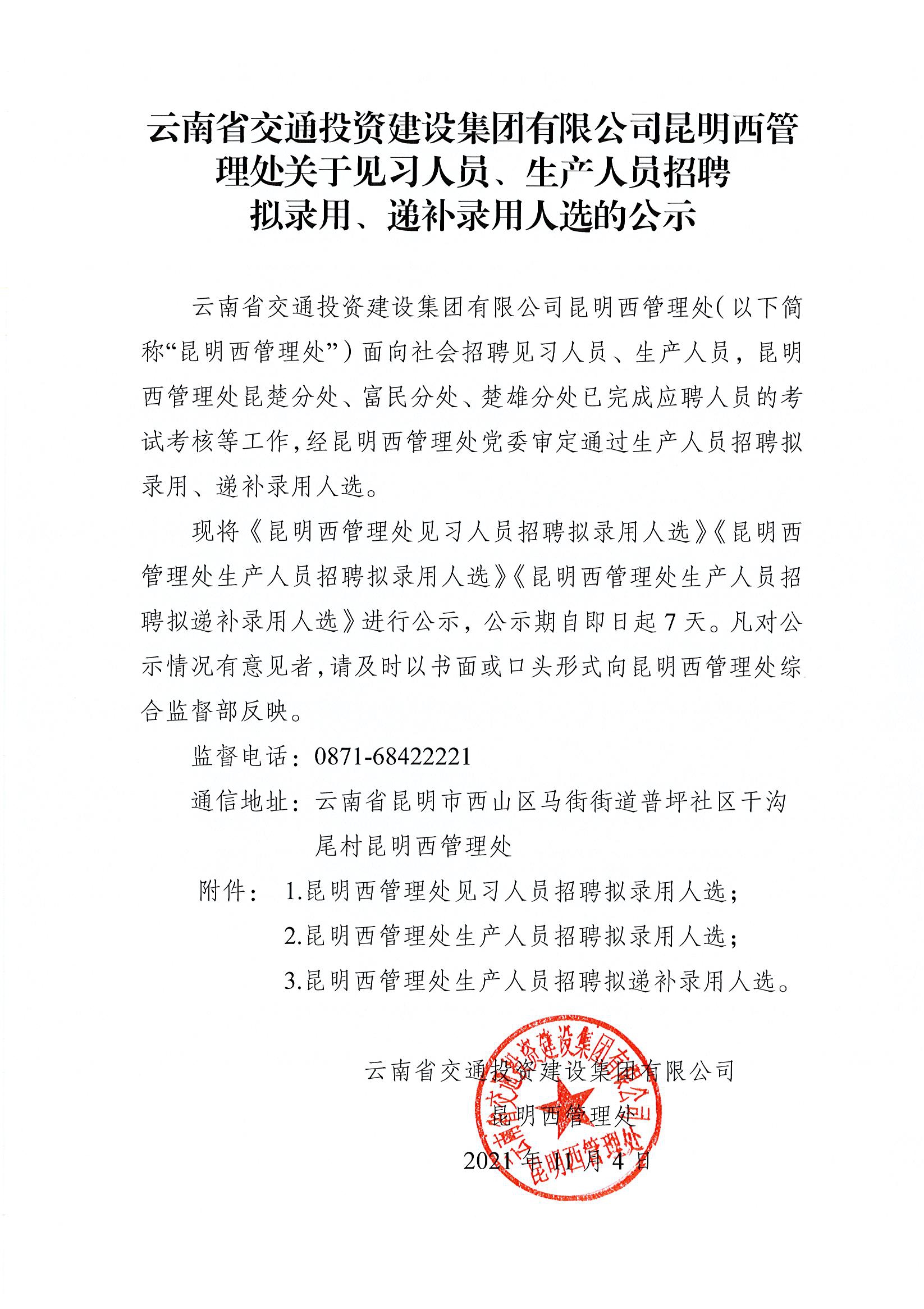 云南省交投建設(shè)集團有限公司昆明西管理處關(guān)于見習人員、生產(chǎn)人員招聘擬錄用、遞補錄用人選的公示