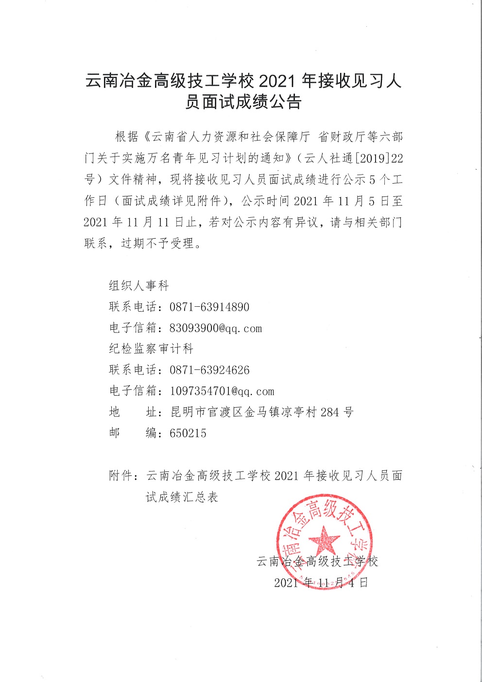 云南冶金高級技工學校2021年接收見習人員面試成績公告