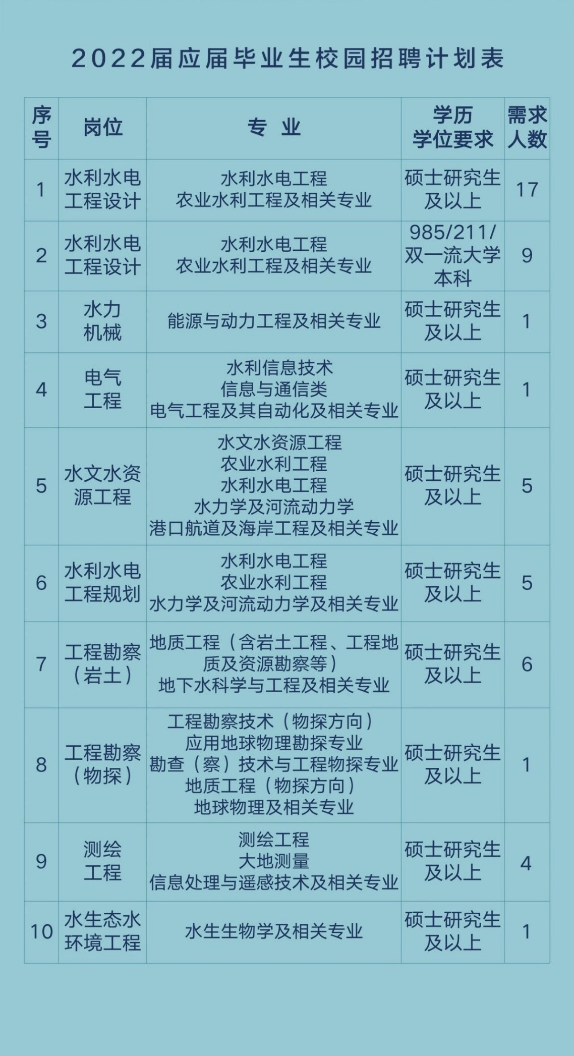 (二)2022屆碩士研究生及以上應(yīng)屆畢業(yè)生(水利水電工程設(shè)計(jì)崗位部分可放寬至985/211/雙一流大學(xué)本科應(yīng)屆畢業(yè)生),詳見招聘計(jì)劃表。