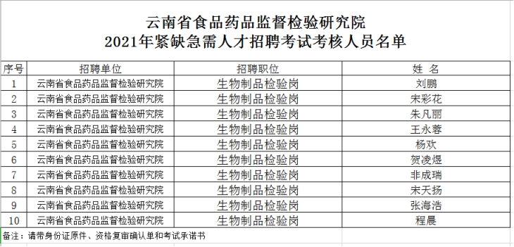 附件:云南省食品藥品監(jiān)督檢驗研究院2021年緊缺急需人才招聘考試考核人員名單