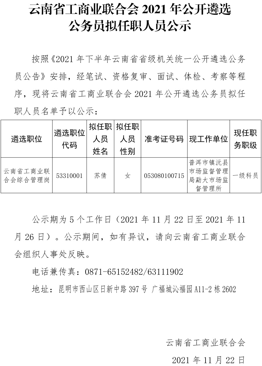 云南省工商業(yè)聯(lián)合會(huì)2021年公開(kāi)遴選公務(wù)員擬任職人員公示