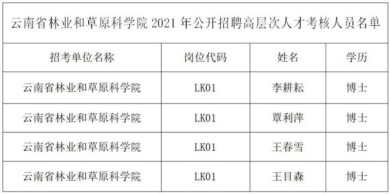 根據(jù)《云南省林業(yè)和草原科學(xué)院2021年公開招聘高層次人才公告》,結(jié)合崗位條件及資格復(fù)審情況,現(xiàn)將云南省林業(yè)和草原科學(xué)院2021年公開招聘高層次人才考核有關(guān)事項公告如下:
