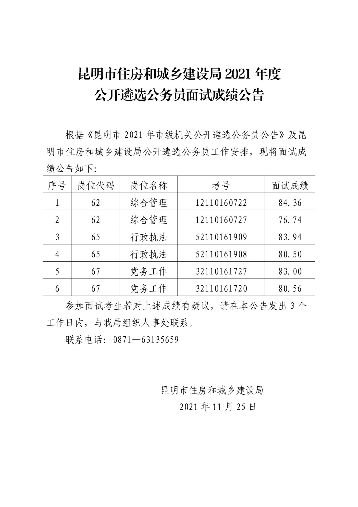 昆明市住房和城鄉(xiāng)建設(shè)局2021年度公開(kāi)遴選公務(wù)員面試成績(jī)公告