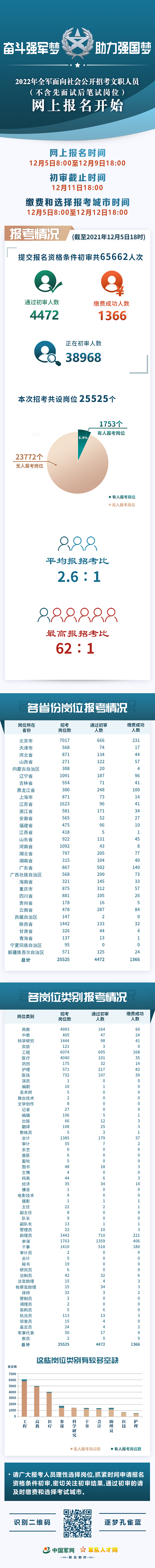 2022年全軍面向社會公開招考文職人員(不含先面試后筆試崗位)網(wǎng)上報名于2021年12月5日8時正式開通。截至12月5日18時,提交報名資格條件初審共65662人次,通過報名資格條件初審的報考人員4472人,繳費成功的報考人員1366人,用人單位正在進行報名資格條件初審的報考人員38968人。有人報考的崗位1753個、占6.9%,平均報招考比為2.6∶1,最高報招考比為62∶1。此次招考網(wǎng)上報名時間為2021年12月5日8:00至9日18:00,報名資格條件初審截止時間為12月11日18:00,繳費和選擇報考城市時間為12月5日8:00至12日18:00。請廣大報考人員理性選擇崗位,抓緊時間申請報名資格條件初審,密切關(guān)注初審結(jié)果,通過初審的請及時繳費和選擇考試城市。相關(guān)招考崗位報考情況如下: