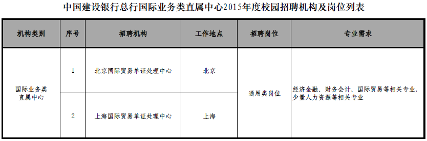 (具體招聘機(jī)構(gòu)、崗位及專業(yè)需求詳見附件:中國(guó)建設(shè)銀行總行國(guó)際業(yè)務(wù)類直屬中心2015年度校園招聘機(jī)構(gòu)及崗位列表)