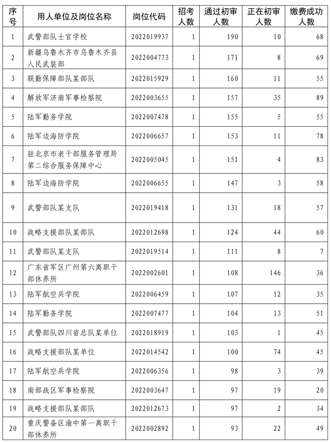 2022年全軍面向社會公開招考文職人員(不含先面試后筆試崗位)網(wǎng)上報名火熱進行中。截至12月6日17時,提交報名資格條件初審共165287人次,通過報名資格條件初審的報考人員30821人,繳費成功的報考人員14209人,用人單位正在進行報名資格條件初審的報考人員78027人。有人報考的崗位6862個、占26.9%,平均報招考比為4.5∶1,最高報招考比為190∶1。此次招考網(wǎng)上報名時間為2021年12月5日8:00至9日18:00,報名資格條件初審截止時間為12月11日18:00,繳費和選擇報考城市時間為12月5日8:00至12日18:00。請廣大報考人員理性選擇崗位,抓緊時間申請報名資格條件初審,密切關注初審結果,通過初審的請及時繳費和選擇考試城市。相關招考崗位報考情況如下: