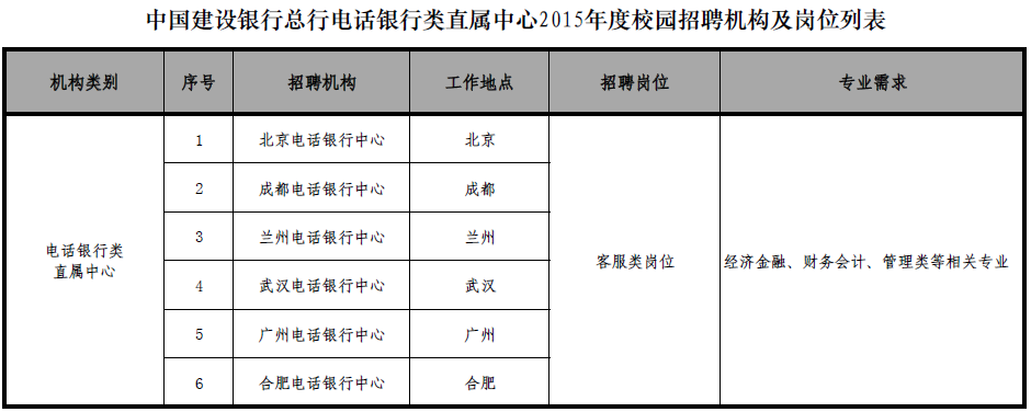 (具體招聘機(jī)構(gòu)、崗位及專業(yè)需求詳見(jiàn)附件:中國(guó)建設(shè)銀行總行電話銀行類直屬中心2015年度校園招聘機(jī)構(gòu)及崗位列表)