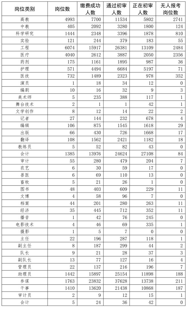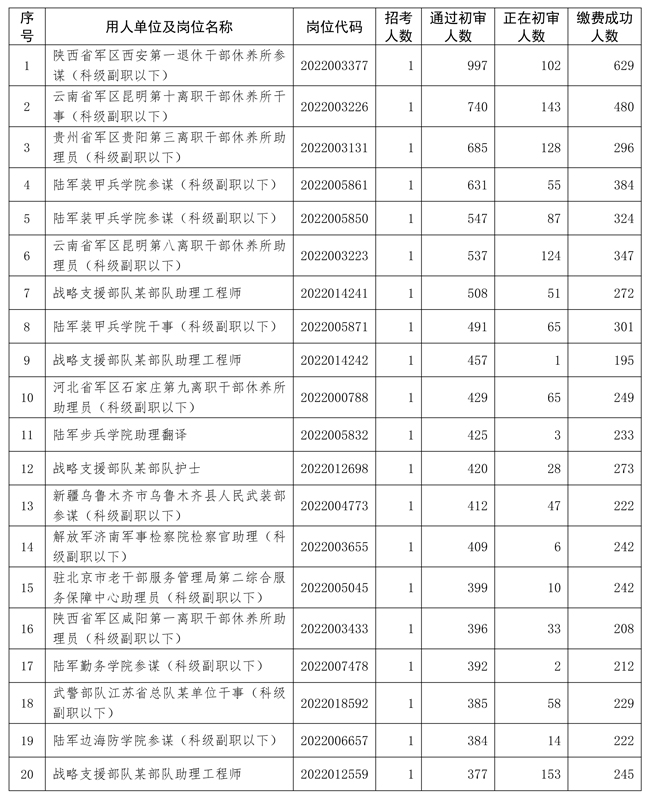 2022年全軍面向社會公開招考文職人員(不含先面試后筆試崗位)網(wǎng)上報名火熱進行中。截至12月8日17時,提交報名資格條件初審共546363人次,通過網(wǎng)上報名資格條件初審的報考人員182464人,繳費成功的報考人員114104名,用人單位正在進行報名資格條件初審的報考人員105424人。有人報考的崗位15656個、占61.3%,平均報招考比為11.7:1,最高報招考比為997:1。此次招考網(wǎng)上報名時間還剩最后1天,請廣大報考人員抓緊時間申請報名資格條件初審,密切關(guān)注初審結(jié)果。因各城市考試席位有限,通過初審的報考人員請及時繳費和選擇考試城市。相關(guān)招考崗位報考情況如下: