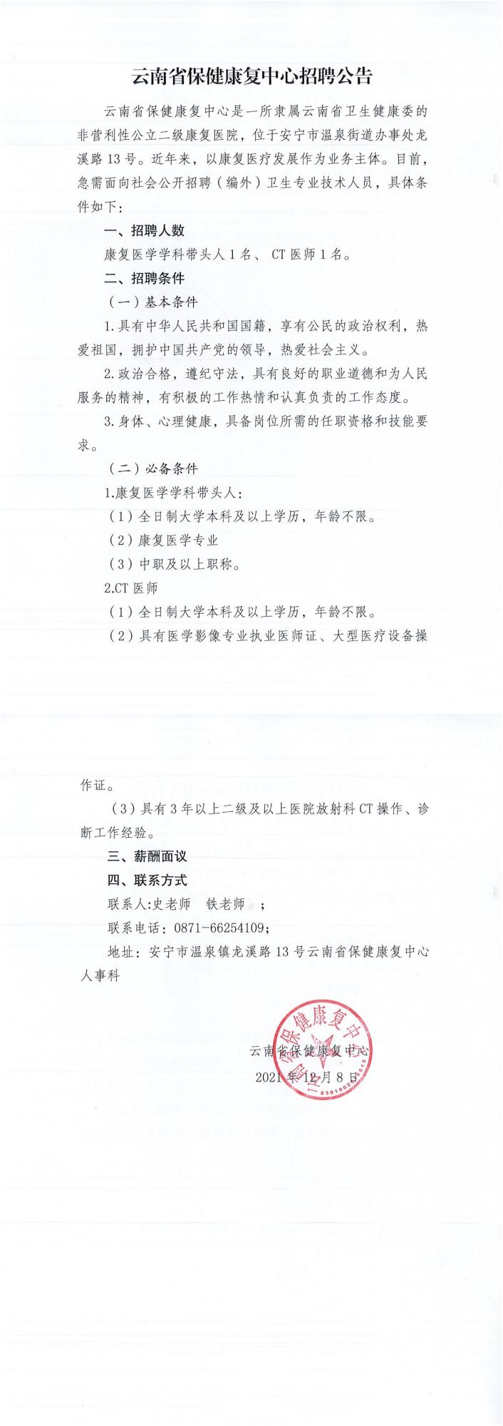 2021年云南省保健康復中心招聘公告