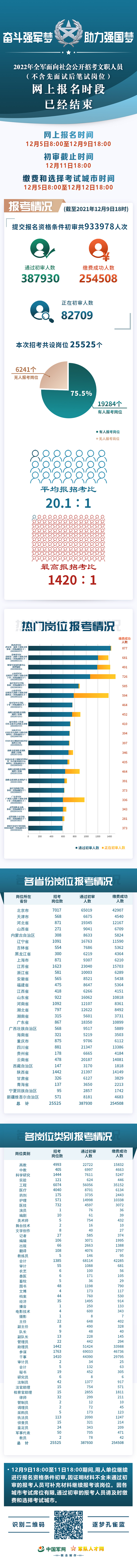 2022年全軍面向社會(huì)公開招考文職人員(不含先面試后筆試崗位)報(bào)名時(shí)段已經(jīng)結(jié)束。截至12月9日18時(shí),提交報(bào)名資格條件初審共933978人次,通過初審的報(bào)考人員387930人,繳費(fèi)成功的報(bào)考人員254508名,用人單位正在進(jìn)行初審的報(bào)考人員82709人。有人報(bào)考的崗位19284個(gè)、占75.5%,平均報(bào)招考比為20.1:1,最高報(bào)招考比為1420:1。12月9日18:00至11日18:00期間,用人單位繼續(xù)進(jìn)行報(bào)名資格條件初審,因證明材料不全未通過初審的報(bào)考人員可補(bǔ)充材料繼續(xù)報(bào)考該崗位。因各城市考試席位有限,通過初審的報(bào)考人員請(qǐng)及時(shí)繳費(fèi)和選擇考試城市。