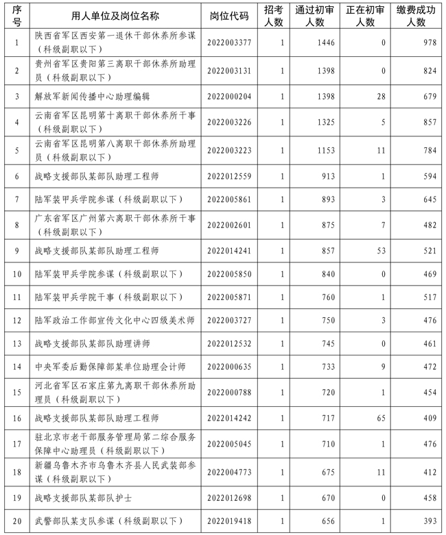 2022年全軍面向社會公開招考文職人員(不含先面試后筆試崗位)網(wǎng)上報名資格條件初審正在進(jìn)行中。截至12月10日17時,提交報名資格條件初審共975324人次,通過初審的報考人員447958人,繳費成功的報考人員320623名,用人單位正在進(jìn)行初審的報考人員17063人。有人報考的崗位19731個、占77.3%,平均報招考比為22.7:1,最高報招考比為1446:1。12月11日18:00前,用人單位繼續(xù)進(jìn)行報名資格條件初審,因證明材料不全未通過初審的報考人員可補(bǔ)充材料繼續(xù)報考該崗位。因各城市考試席位有限,通過初審的報考人員請及時繳費和選擇考試城市。