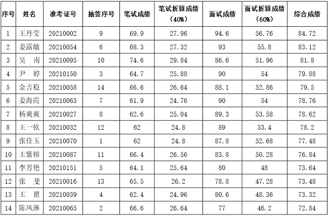 根據(jù)《昆明市投資促進(jìn)局2021年11月對(duì)外公開招聘勞務(wù)派遣制工作人員公告》程序,現(xiàn)就筆試、面試綜合成績(jī)公示如下:
