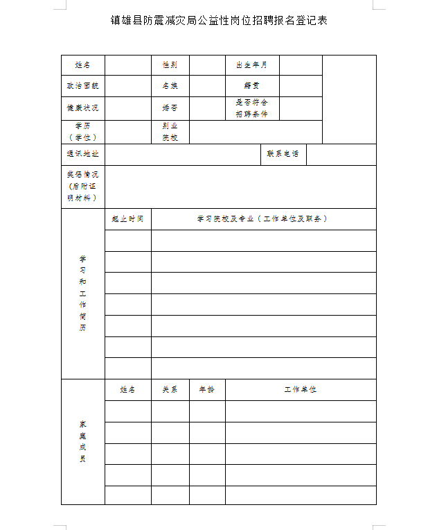 3.報(bào)名時(shí)所需材料:報(bào)名方式為現(xiàn)場報(bào)名。報(bào)名時(shí)攜帶本人近期紅底免冠二寸照片3張、身份證、戶口冊(cè)、《就業(yè)創(chuàng)業(yè)證》或《就業(yè)失業(yè)登記證》原件及復(fù)印件和《鎮(zhèn)雄縣防震減災(zāi)局公益性崗位報(bào)名登記表》(見附件),個(gè)人所提供的相關(guān)證件、資料必須真實(shí)有效,不得弄虛作假。凡弄虛作假者一經(jīng)查實(shí),即取消報(bào)名資格。