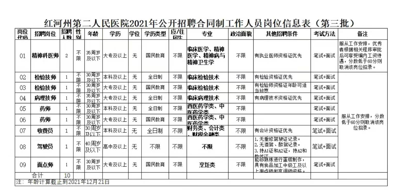 本次招聘合同制人員10人,具體崗位見《紅河州第二人民醫(yī)院2021年公開招聘合同制工作人員崗位信息表(第三批)》
