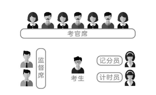 結構化面試考場一般會有5-9名考官,另外還有計時員、記分員、監(jiān)督員。結構化面試的考場布置如下。
