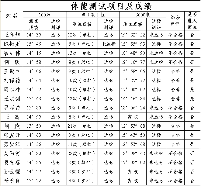 1、合格標(biāo)準(zhǔn):3000米(17′51″)、100米(15″75)、單杠引體向上(8次)或雙杠杠端臂屈伸(8次),三項(xiàng)測(cè)評(píng)均達(dá)標(biāo),綜合測(cè)評(píng)為合格,若有其中一項(xiàng)或多項(xiàng)不達(dá)標(biāo),視為綜合測(cè)評(píng)不合格,綜合測(cè)評(píng)合格者方有資格參加面試;