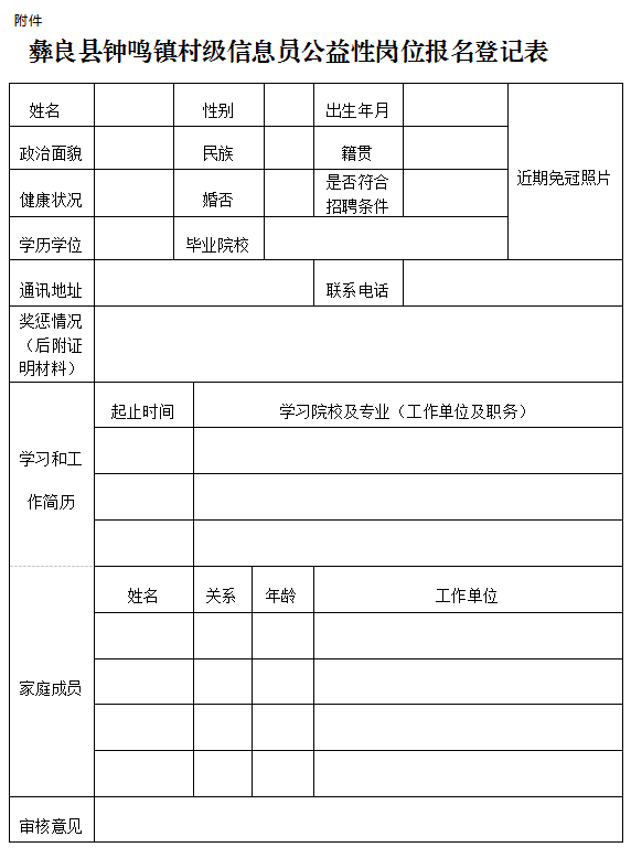 附件:彝良縣鐘鳴鎮(zhèn)村級(jí)信息員公益性崗位報(bào)名表