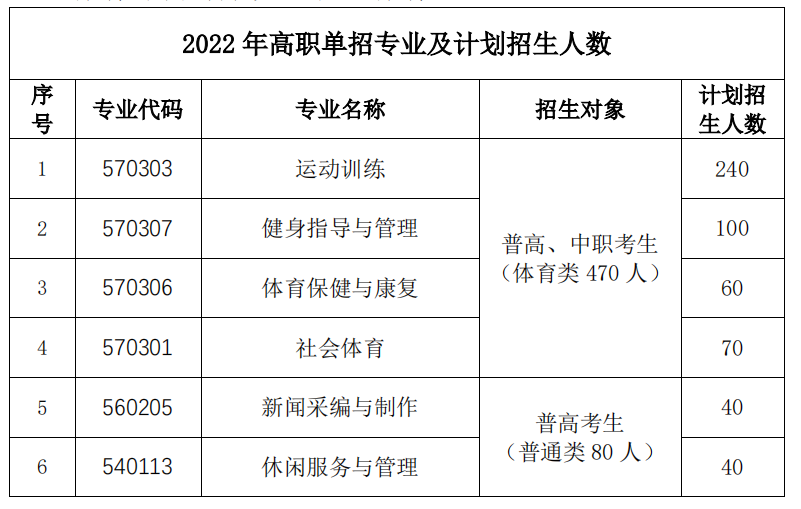 2022年我校高職單招計(jì)劃招生550人,各專(zhuān)業(yè)具體招生名額以上級(jí)實(shí)際下達(dá)計(jì)劃數(shù)量為準(zhǔn);計(jì)劃6個(gè)專(zhuān)業(yè)面向高職單招考生招生,其中普通類(lèi)專(zhuān)業(yè)2個(gè):新聞采編與制作、休閑服務(wù)與管理;體育類(lèi)專(zhuān)業(yè)4個(gè):運(yùn)動(dòng)訓(xùn)練、健身指導(dǎo)與管理、體育保健與康復(fù)、社會(huì)體育。