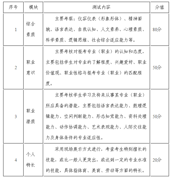 職業(yè)適應(yīng)性測(cè)試包括綜合素質(zhì)面試、專業(yè)適應(yīng)性測(cè)試兩個(gè)方面,滿分200分,考試時(shí)長(zhǎng):職業(yè)適應(yīng)性測(cè)試面試時(shí)間為平均每名考生為6-10分鐘。