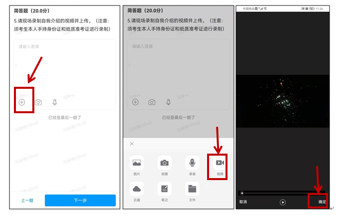 視頻上傳的操作為:點(diǎn)擊下方圖片中所示答案框下方的加號(hào)“+”,點(diǎn)擊視頻按鈕,選擇你剛剛錄制好的視頻,點(diǎn)擊確定,就可以上傳視頻。上傳完成的視頻將自動(dòng)生成附件顯示在答案框內(nèi),即完成視頻錄制與上傳。