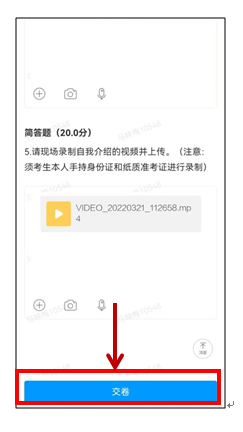 自我介紹視頻錄制期間,需考生持本人身份證和紙質(zhì)準(zhǔn)考證進(jìn)行錄制。自我介紹和才藝展示的兩段視頻錄制時(shí)長(zhǎng)自行控制,但不宜過(guò)長(zhǎng)或過(guò)短。錄制完成之后,回到學(xué)習(xí)通APP考試界面,點(diǎn)擊繼續(xù)考試,進(jìn)行視頻的上傳。